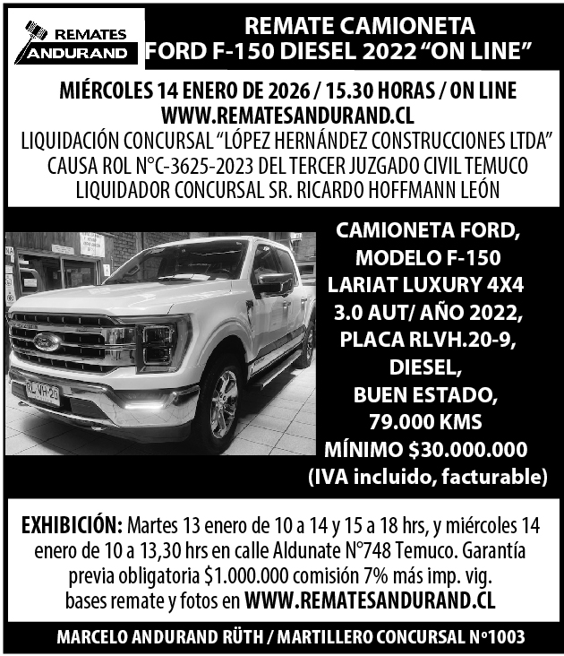 REMATE CAMIONETA FORD F-150, VEHICULOS, ENSERES VARIOS 100% ON LINE