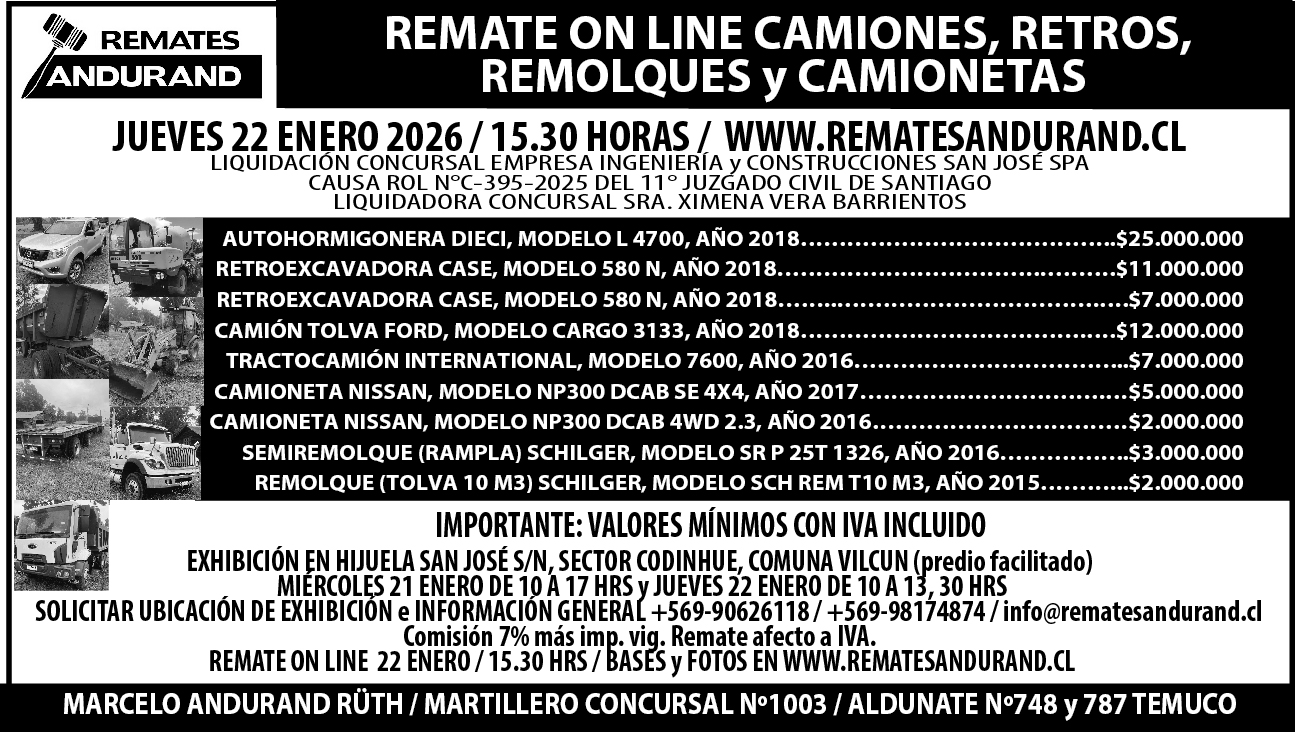 REMATE CAMIONES, RETROEXCAVADORAS, AUTOMOVILES, ENSERES VARIOS, 100% ON LINE