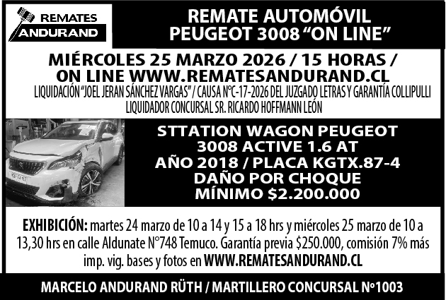 REMATE FORD RANGER 2022 XLT, RETROEXCAVADORA CATERPILLAR, SW PEUGEOT 3008, CHEVROLET SONIC, PEUGEOT 301, SW CHERY TIGGO 3, EQUIPAMIENTO MINIMARKET, EXCEDENTES CONSTRUCCION, MOBILIARIO PATIO COMIDAS, OTROS VARIOS